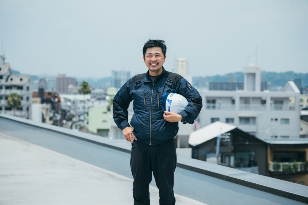 大型建築の現場で経験を重ね、工程管理、安全管理、品質管理、図面管理などのマルチタスクをバリバリとこなす工務本部建築部工事課長・濵田佳幸(はまだよしゆき)さん。高校時代にインターンシップで見学した内村建設のSRC(鉄骨鉄筋コンクリート)造りの迫力ある現場にひかれて入社。現在は、朗らかで親しみやすい人柄で現場をつなぐ一方、緻密に計画を立てて仕事を進める一面も。建築の仕事の魅力や働き方についての考えや未来へ描く夢などについてお話を聞きました。